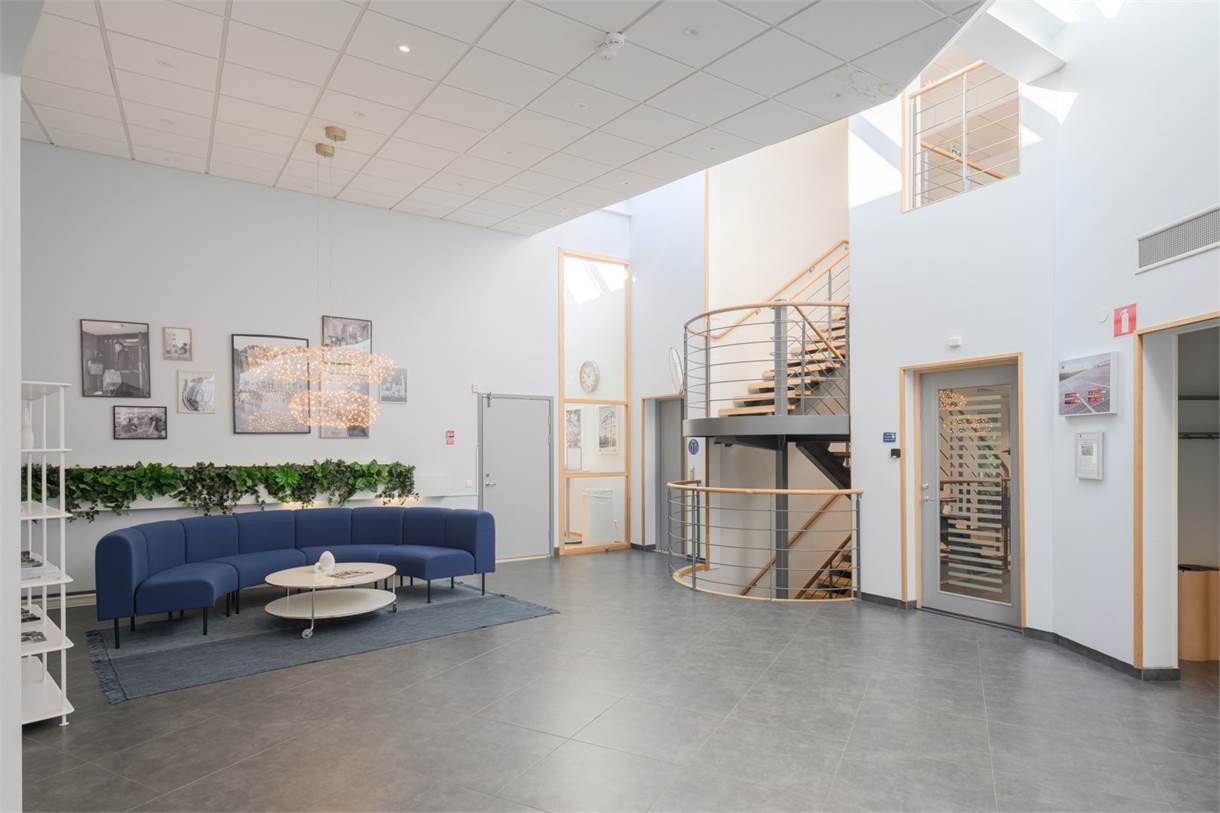 Den inbjudande entrén ger ett professionellt första intryck, och den stensatta uteplatsen med pergola skapar en trivsam plats för pauser, informella möten eller kundbesök under sommarhalvåret. På källarplanet finns ett gym för aktiva pauser, fräscha omklädningsrum samt generösa förrådsutrymmen – allt för att skapa en bekväm och funktionell arbetsvardag.